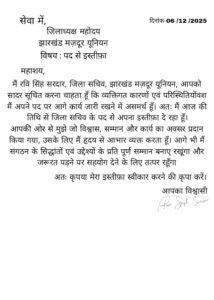 झारखंड के श्रमिक संगठनों में एक बड़ा बदलाव सामने आया है। झारखंड मज़दूर यूनियन के जिला सचिव रवि सिंह सरदार ने अपने पद से इस्तीफ़ा दे दिया है, जिसकी आधिकारिक पुष्टि स्वयं उनके द्वारा जारी किए गए पत्र से हुई है।