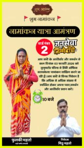 फुलकी महतो ने वार्ड की जनता से अधिक से अधिक संख्या में उपस्थित होकर आशीर्वाद एवं समर्थन देने की अपील की है। उन्होंने कहा कि उनका उद्देश्य वार्ड का समग्र विकास, साफ-सफाई, सड़क, पानी, बिजली और जनसमस्याओं का समाधान करना है।नामांकन को लेकर पूरे क्षेत्र में उत्सव जैसा माहौल है और समर्थक इसे बदलाव की शुरुआत मान रहे हैं।