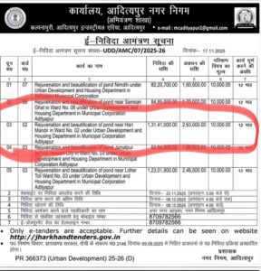आदित्यपुर नगर निगम क्षेत्र के विकास को लेकर एक अहम कदम उठाया गया है। मिली जानकारी के अनुसार, नगर निगम द्वारा ई-निविदा आमंत्रण सूचना संख्या – UDD/AMC/07/2025-26 (दिनांक 17.11.2025) जारी करते हुए नगर क्षेत्र के विभिन्न तालाबों के पुनरुद्धार एवं सौंदर्यीकरण (Rejuvenation and Beautification) कार्य के लिए टेंडर निकाला गया है। यह कार्य शहरी विकास एवं आवास विभाग के अंतर्गत कराया जाएगा।प्रस्तावित कार्यों की सूची: