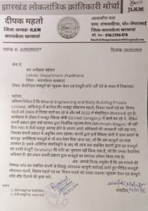सरायकेला-खरसावां जिले के आदित्यपुर स्थित Bharat Engineering and Body Building Private Limited कंपनी के खिलाफ सेवानिवृत्त मजदूरों को न्यूनतम वेतन और ग्रेच्युटी राशि नहीं देने का मामला सामने आया है। इस संबंध में झारखंड लोकतांत्रिक क्रांतिकारी मोर्चा (JLKM) के जिला अध्यक्ष दीपक महतो ने श्रम अधीक्षक, श्रम विभाग झारखंड को लिखित शिकायत दी है।
